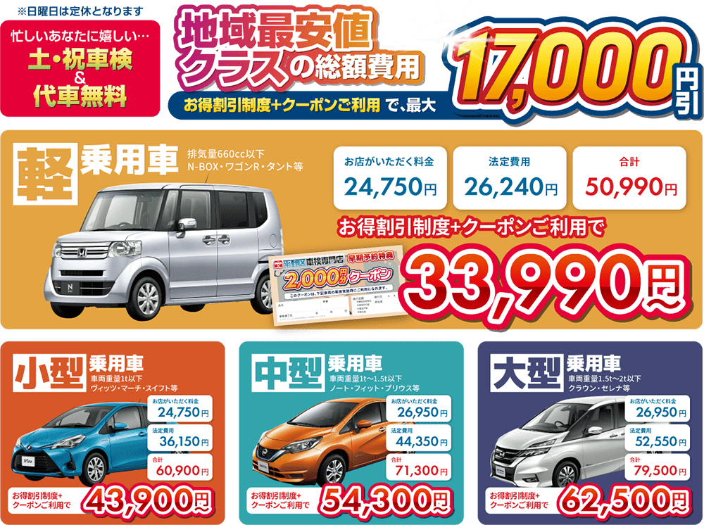 車検専門店だから実現できる、納得の車検プライスをご提供いたします。